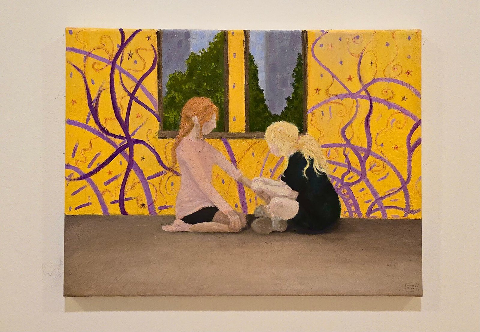 This painting is a nostalgic exploration of being a little girl. The name is something women now say about their childhood friends: “we were girls together”, and that phrase captures sharing all the highs and lows of being a girl: not being alone when you play with dolls, when your mom makes you cry… Girls on this painting are making friendship bracelets – that’s inspired by a memory of mine. Perpetuating friendship with a thread bracelet is an intimate, beautiful bonding experience.